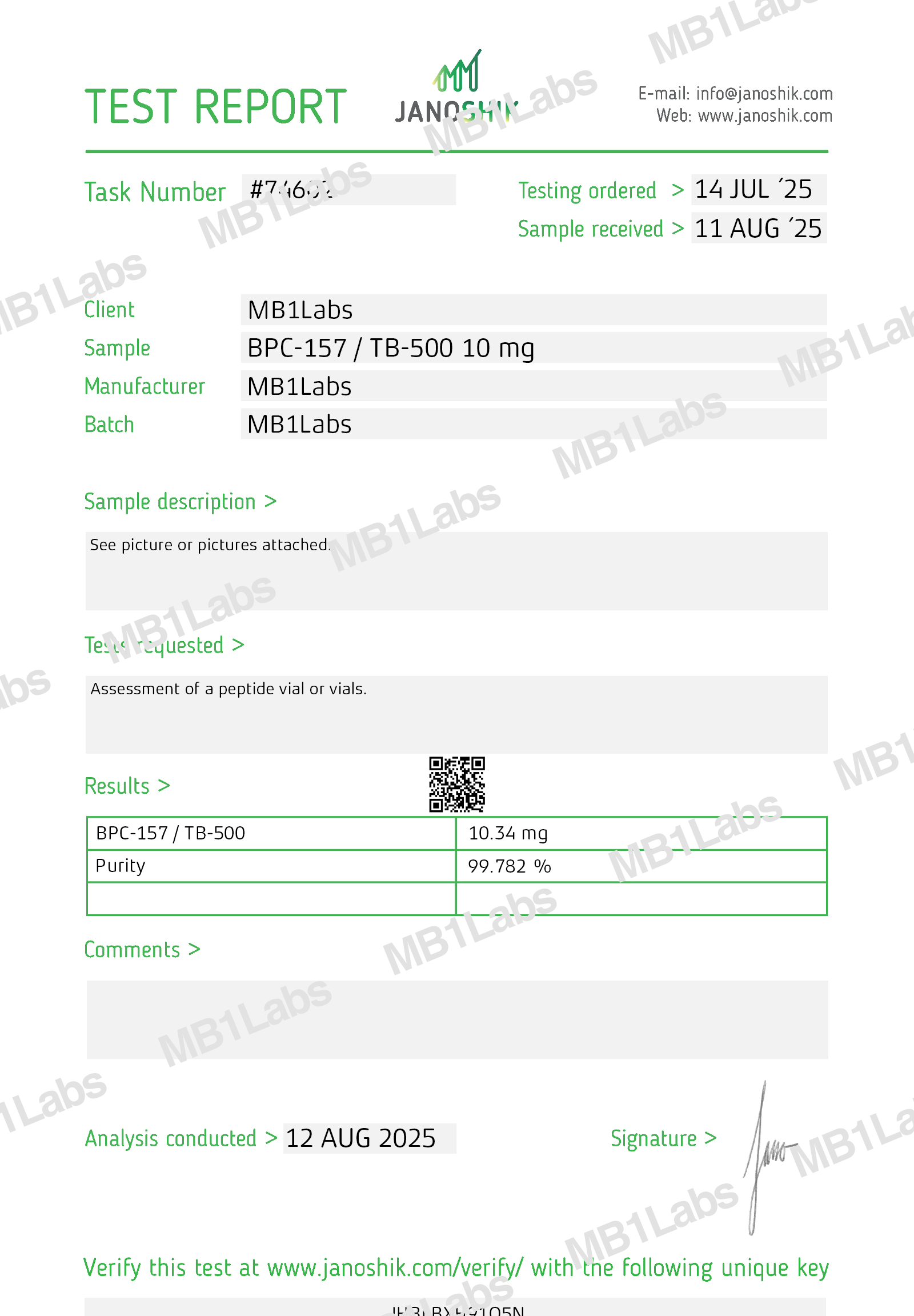 MB1® BPC-157 + TB500 is a high-purity peptide offered in a 5mg/5mg lyophilized powder format, intended strictly for laboratory research and development purposes. Manufactured to exceed 99% purity and tested using both HPLC and LC-MS protocols, this peptide is supplied in a sterile, sealed vial to ensure stability and integrity.
