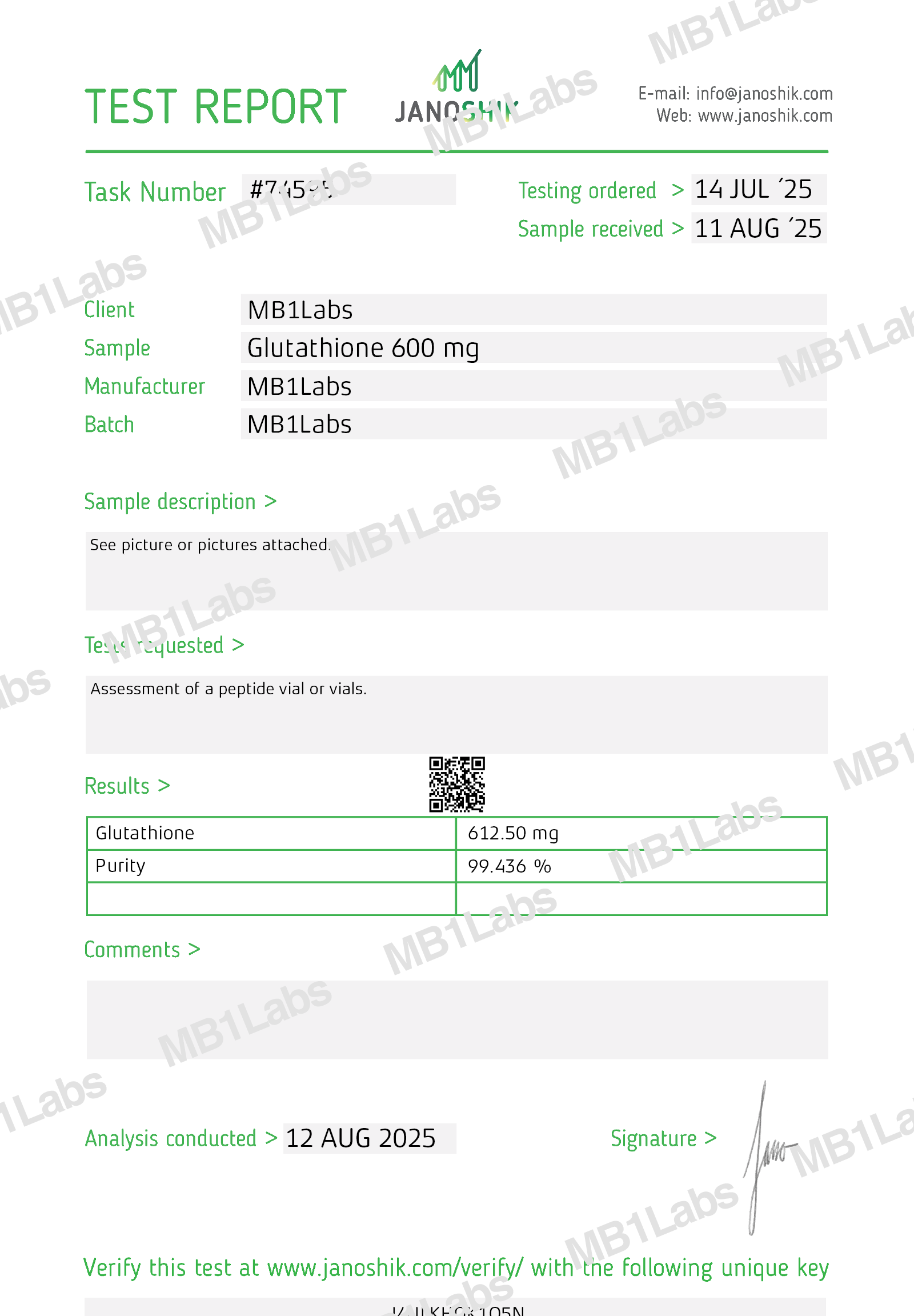 MB1® Glutathione VIAL 600 mg is a high-purity compound offered in a lyophilized powder format, intended strictly for laboratory research and development purposes. Manufactured to exceed 99% purity and tested using both HPLC and LC-MS methods, this product is supplied in a sterile, sealed vial to ensure stability and integrity during storage and handling. Not intended for human or veterinary use.
