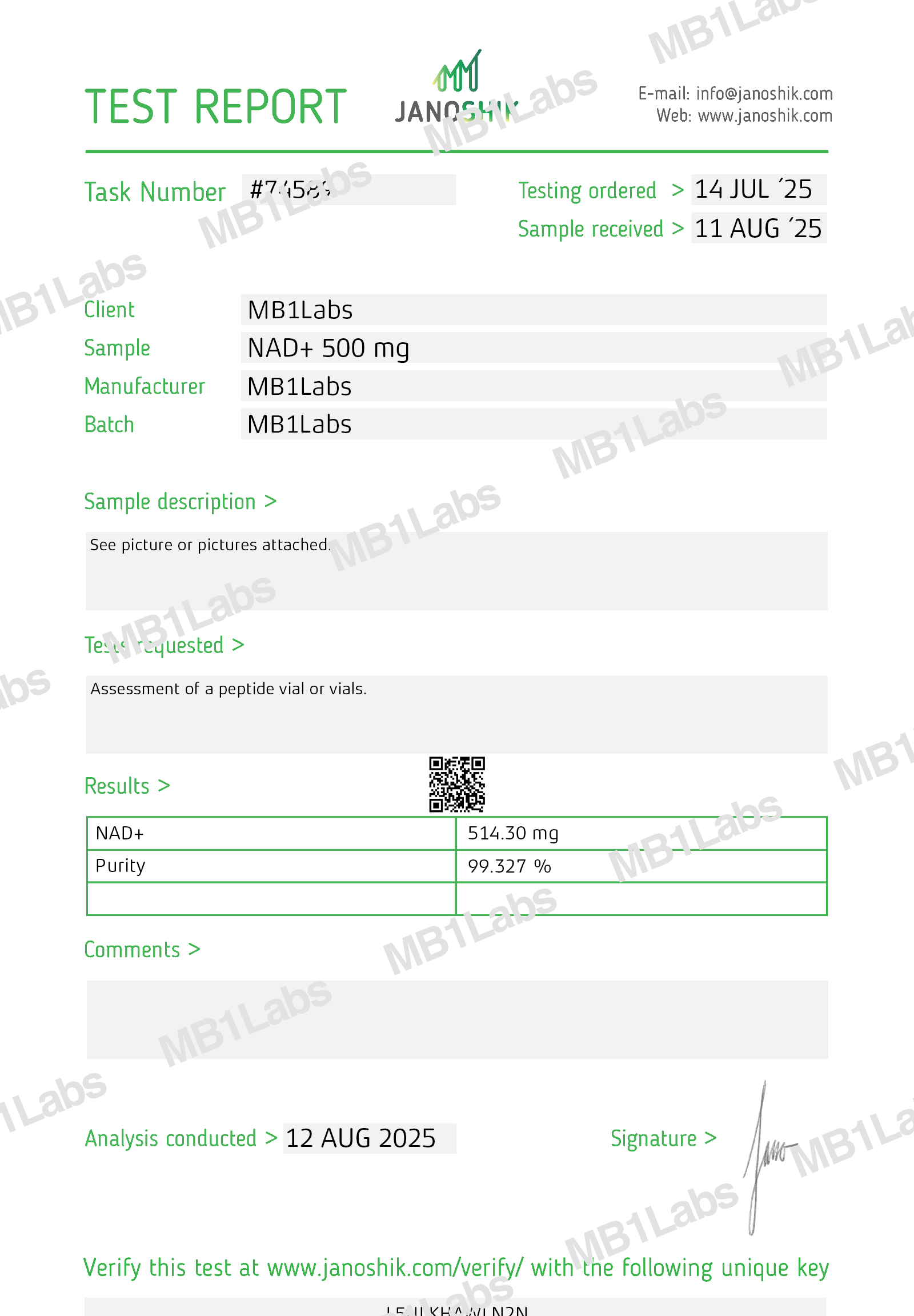 MB1® NAD+ is a high-purity compound offered in a 500mg lyophilized powder format, intended strictly for laboratory research and development purposes. Manufactured to exceed 99% purity and verified through advanced HPLC and LC-MS testing protocols, NAD+ is supplied in a sterile, sealed vial to ensure optimal stability, consistency, and integrity throughout experimental use.